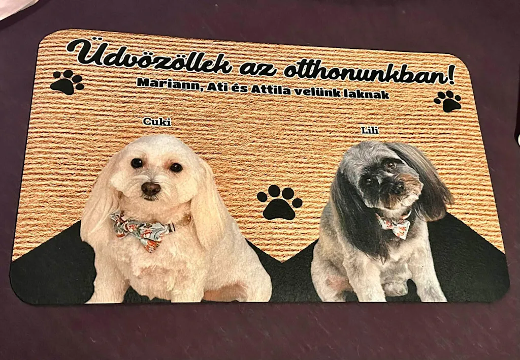 Egyedi fényképes Üdvözöllek az otthonunkban lábtörlő egyedi kutyával vagy macskával - akár 5 házi kedvenc