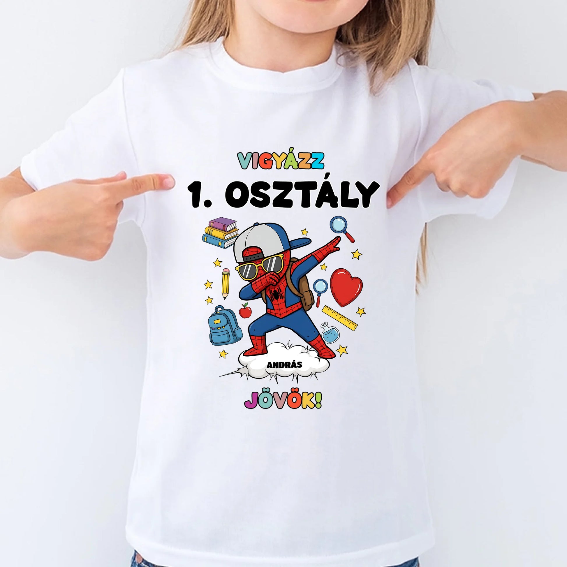 Egyedi vigyázz osztály jövök gyerek póló - szuperhős karakterrel