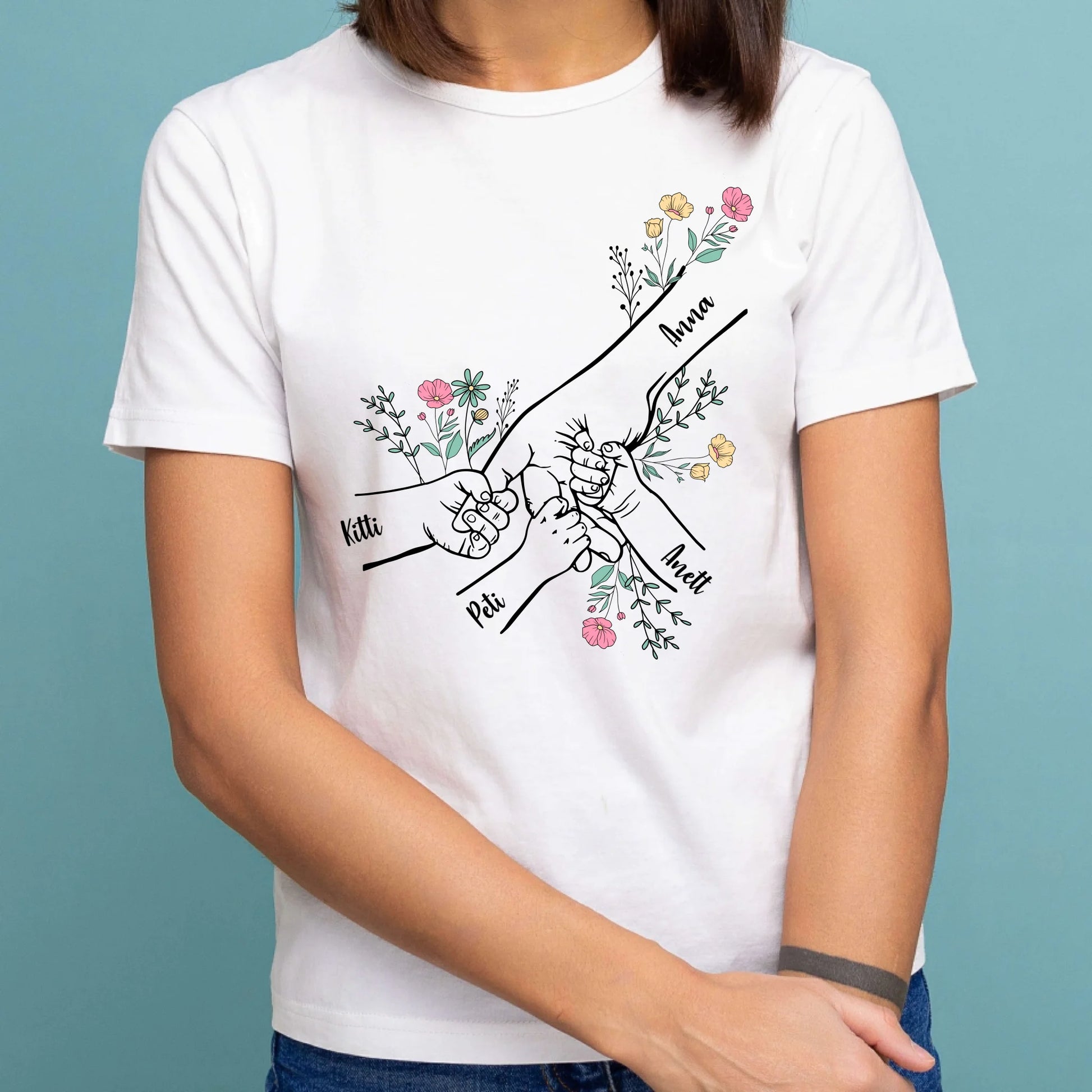 Egyedi virágos anya és gyerekei kézen fogva - női póló