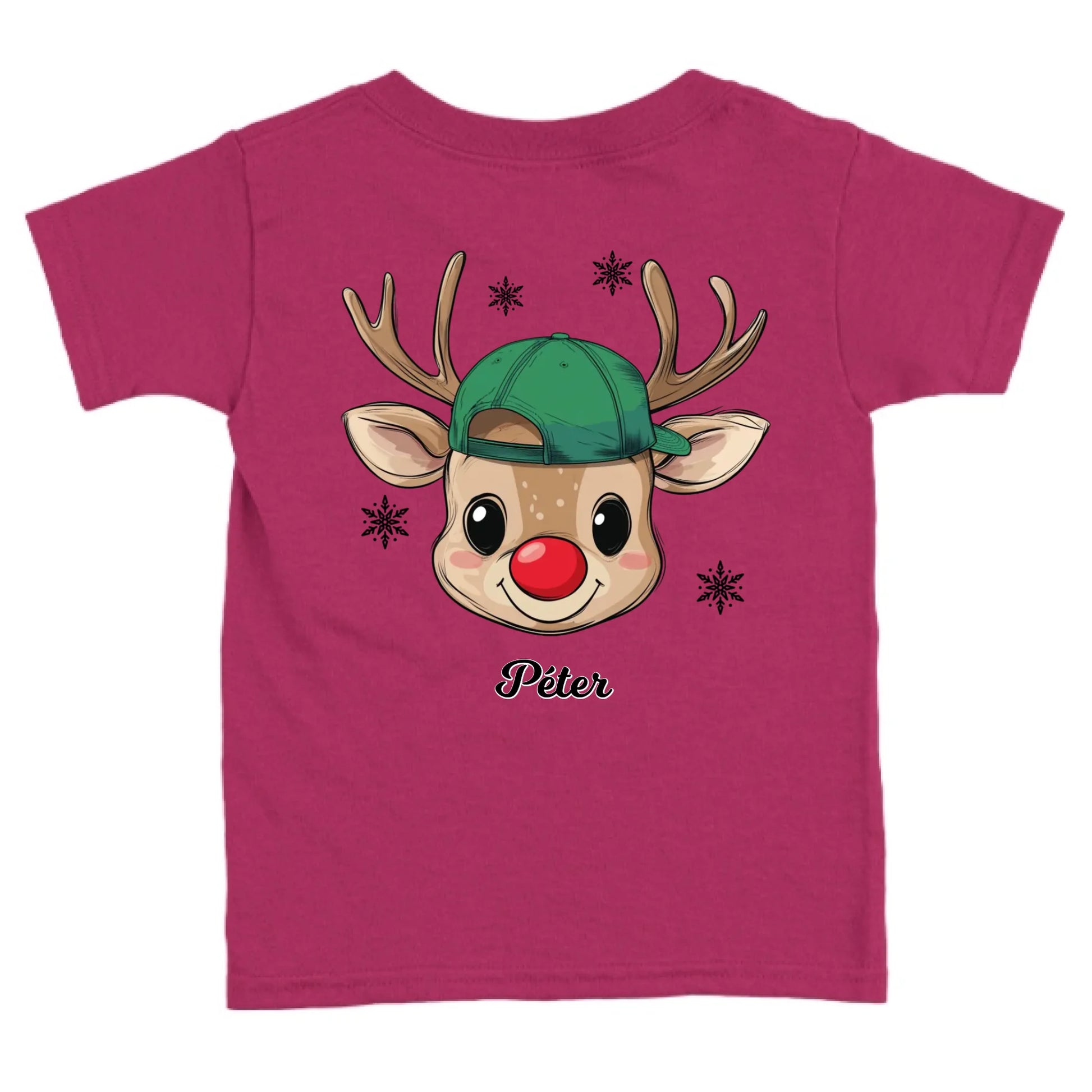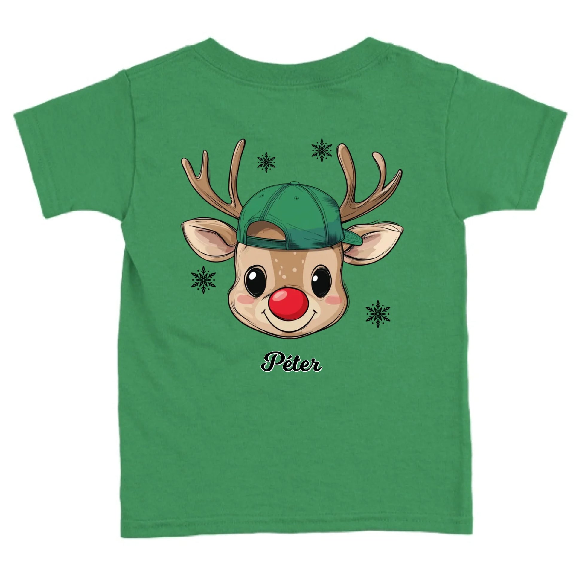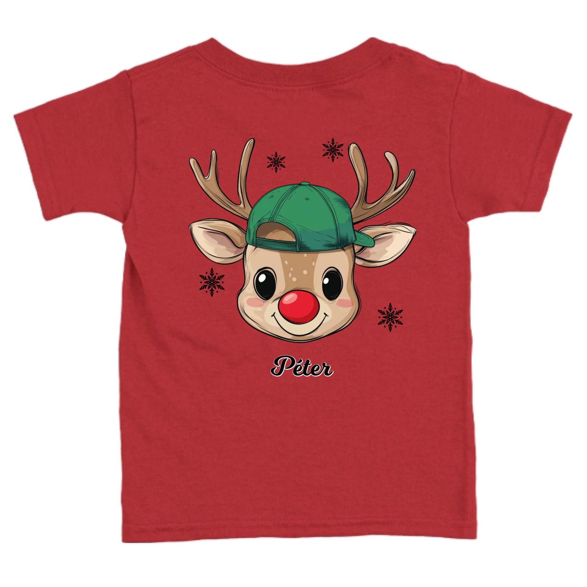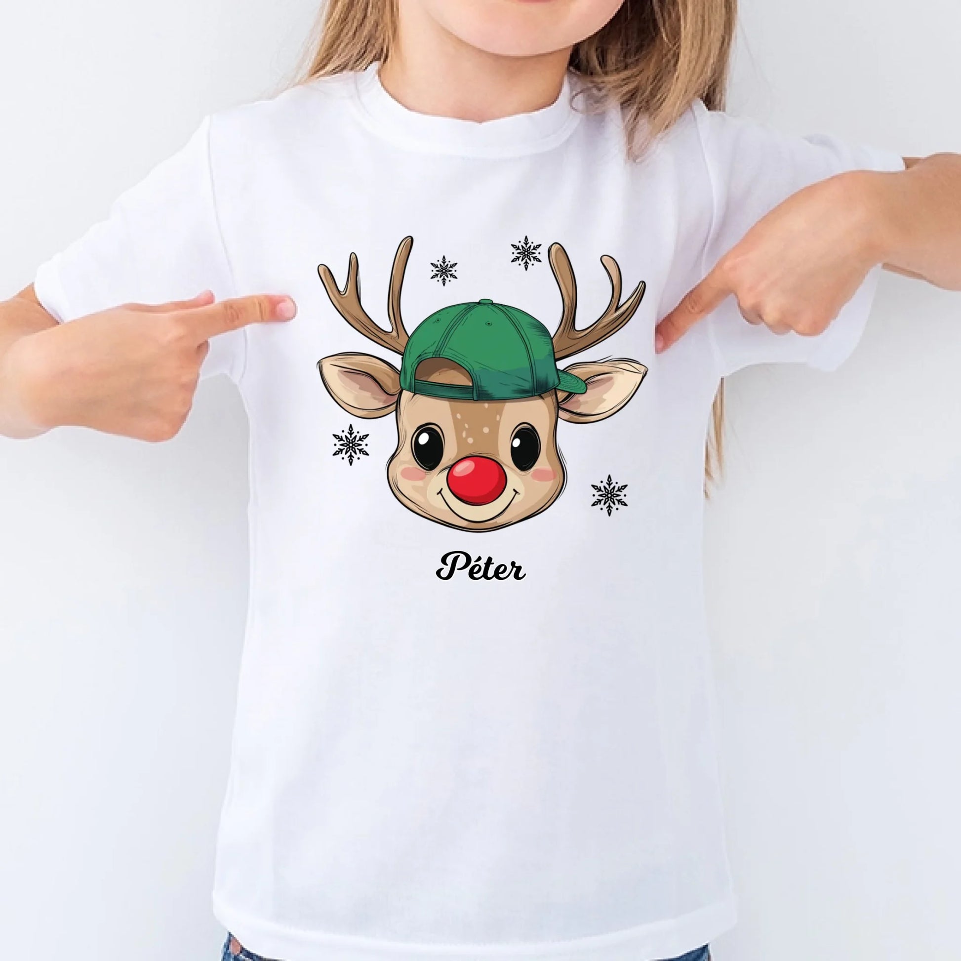 Rénszarvas fiú és lány karakterrel, gyerek unisex póló egyedi névvel