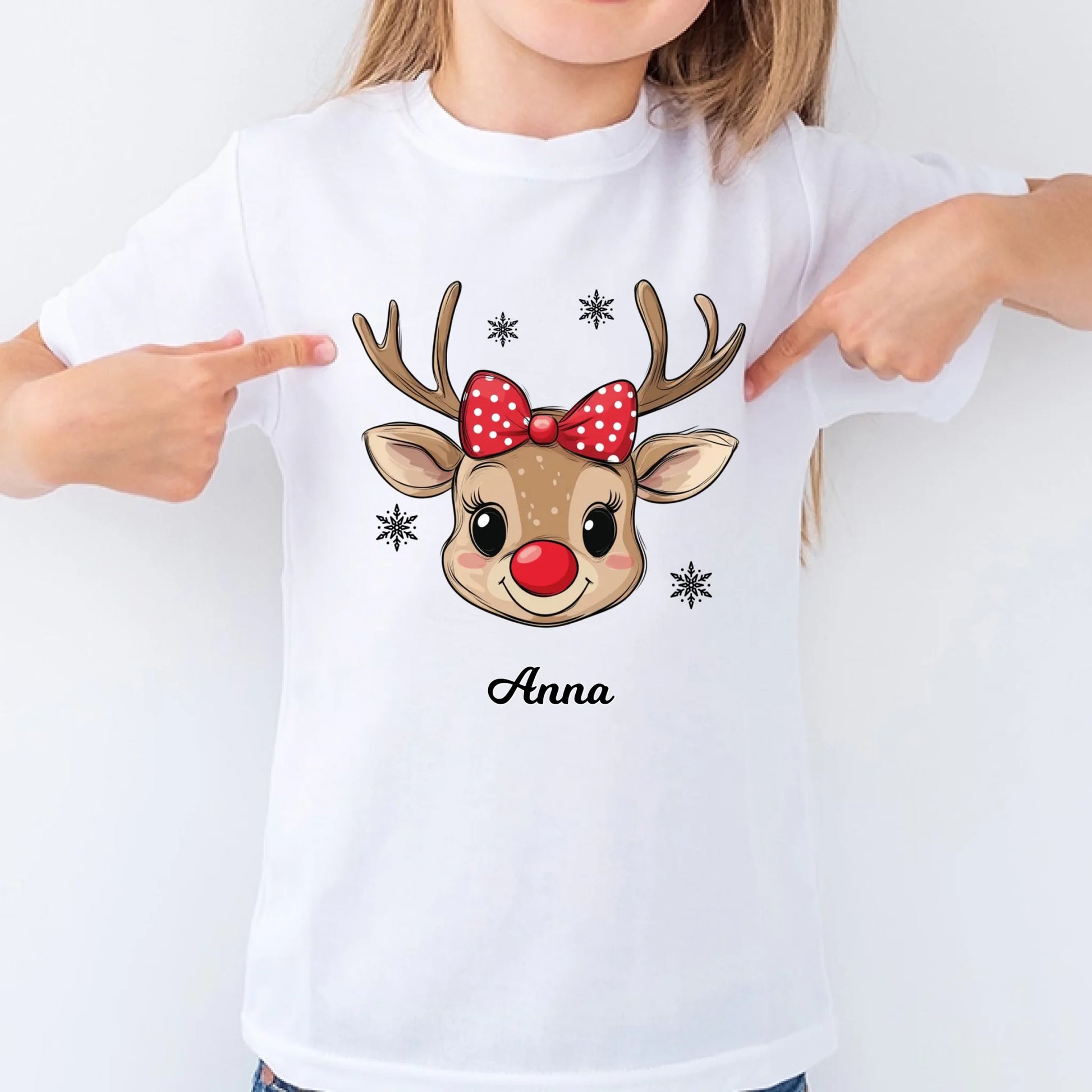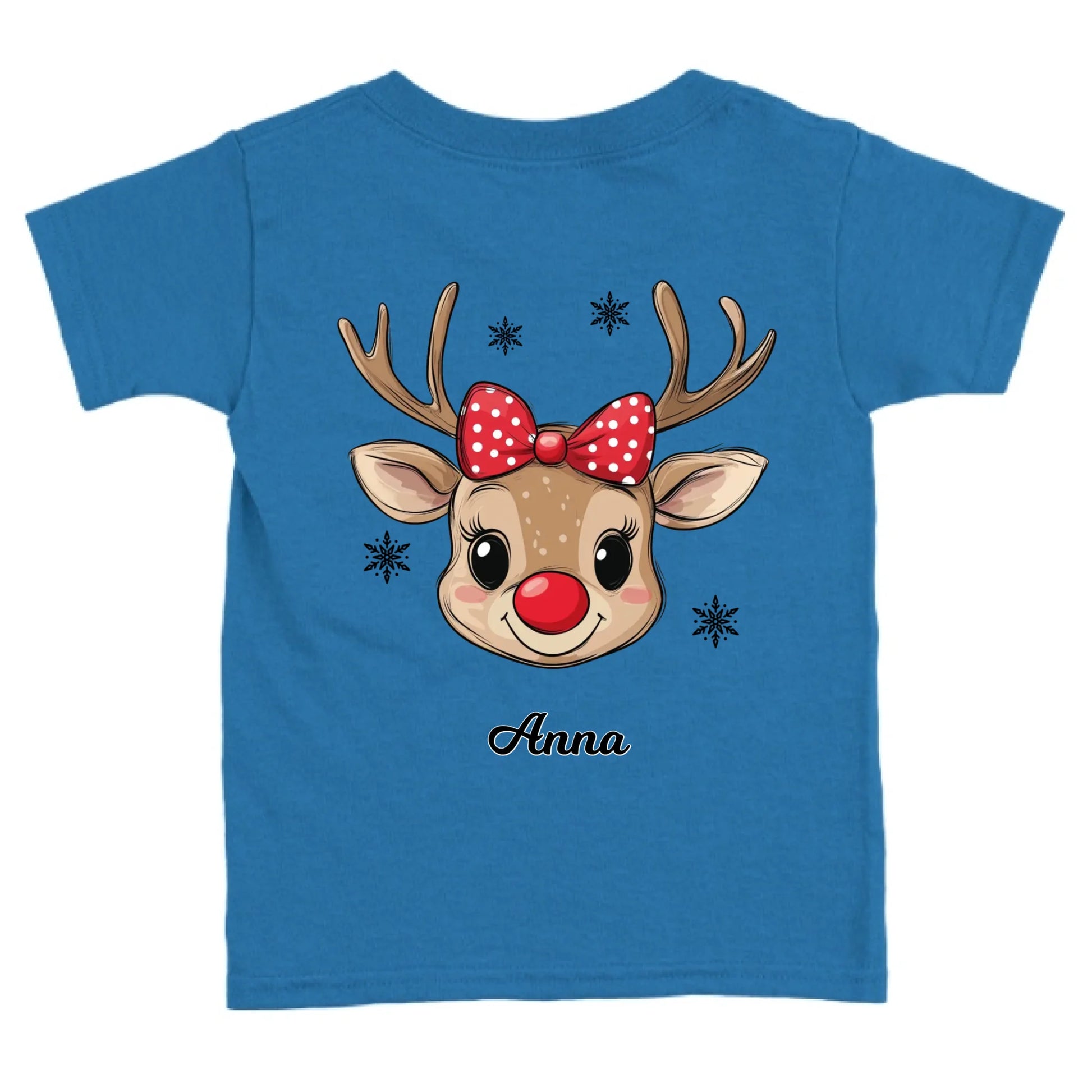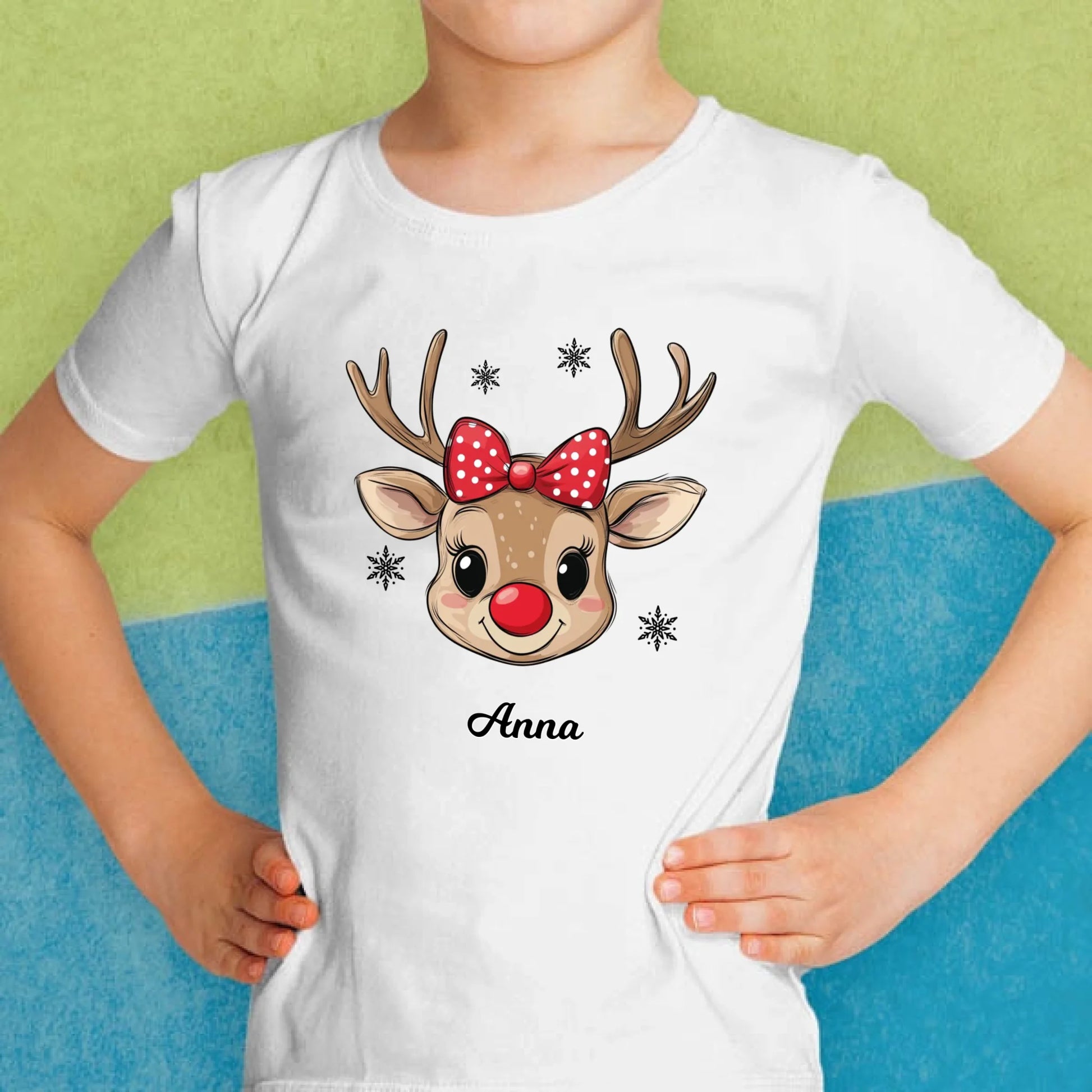 Rénszarvas lány és fiú karakterrel, gyerek unisex póló egyedi névvel
